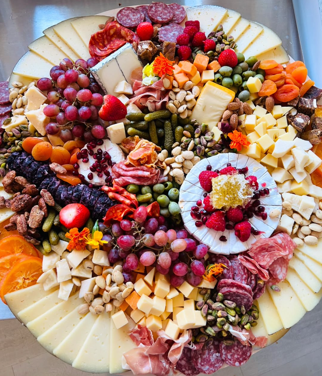 charcuterie, olives, nuts, and various seasonal accompaniments. Crackers served on the side.
