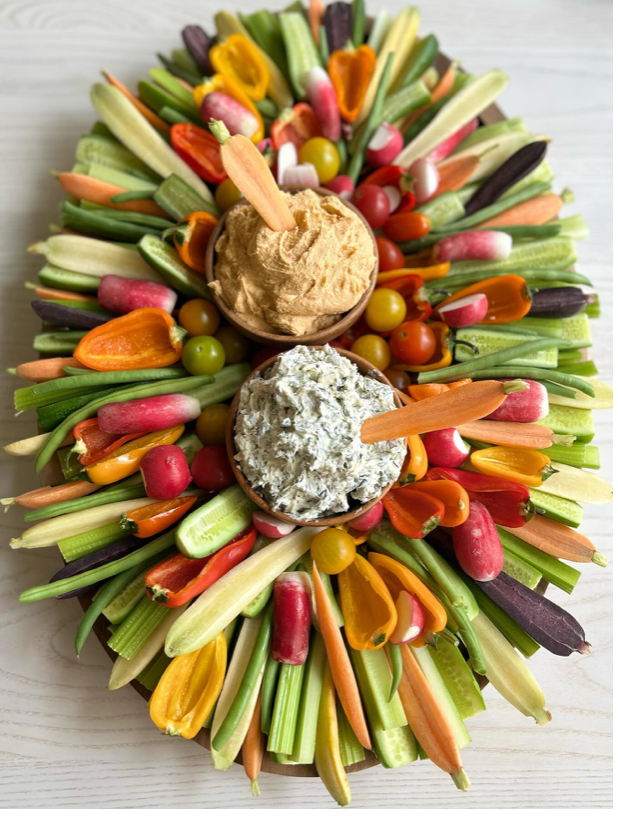 cauliflower, and radishes. Served with hummus and spinach artichoke dip.