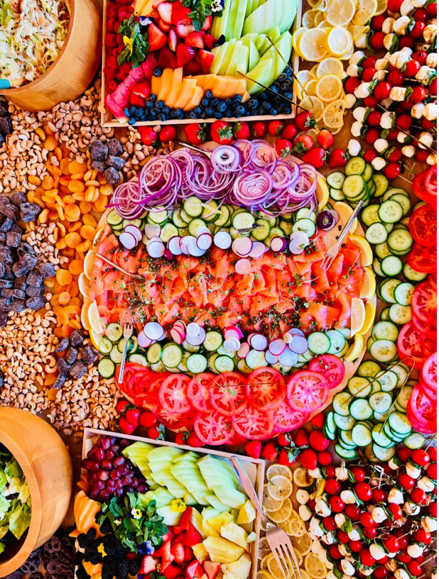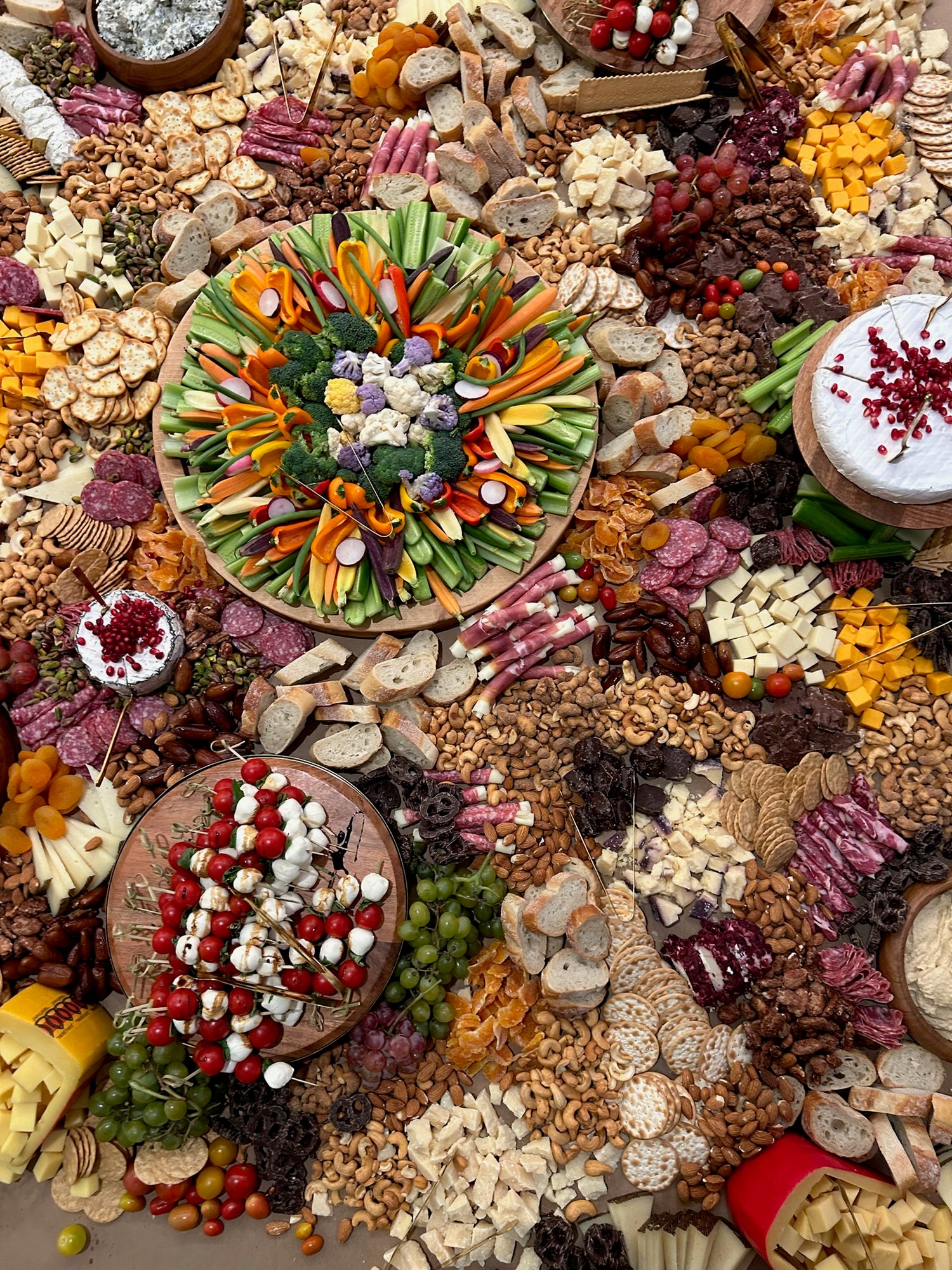 charcuterie, crackers, fresh bread, crudite and dips, olives, nuts, fresh fruit, dried fruit, and caprese skewers.